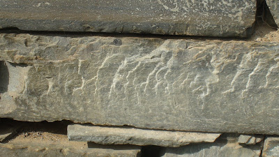 Foliation is shown in the picture below. Folding within these beds were a secondary feature most likely caused from the Alleghenian orogeny. These tectonic events took place approximately 325 – 260 Mya when Africa slammed into North America. The collision formed a huge mountain chain that rivaled the Himalayan Mountain Range exerting massive stress that caused tilting and fracturing and folding. What remains of these mountains is explained in my Thoroughfare Gap blog here http://whattherockstellus.blogspot.com/2012/04/thoroughfare-gap-va.html